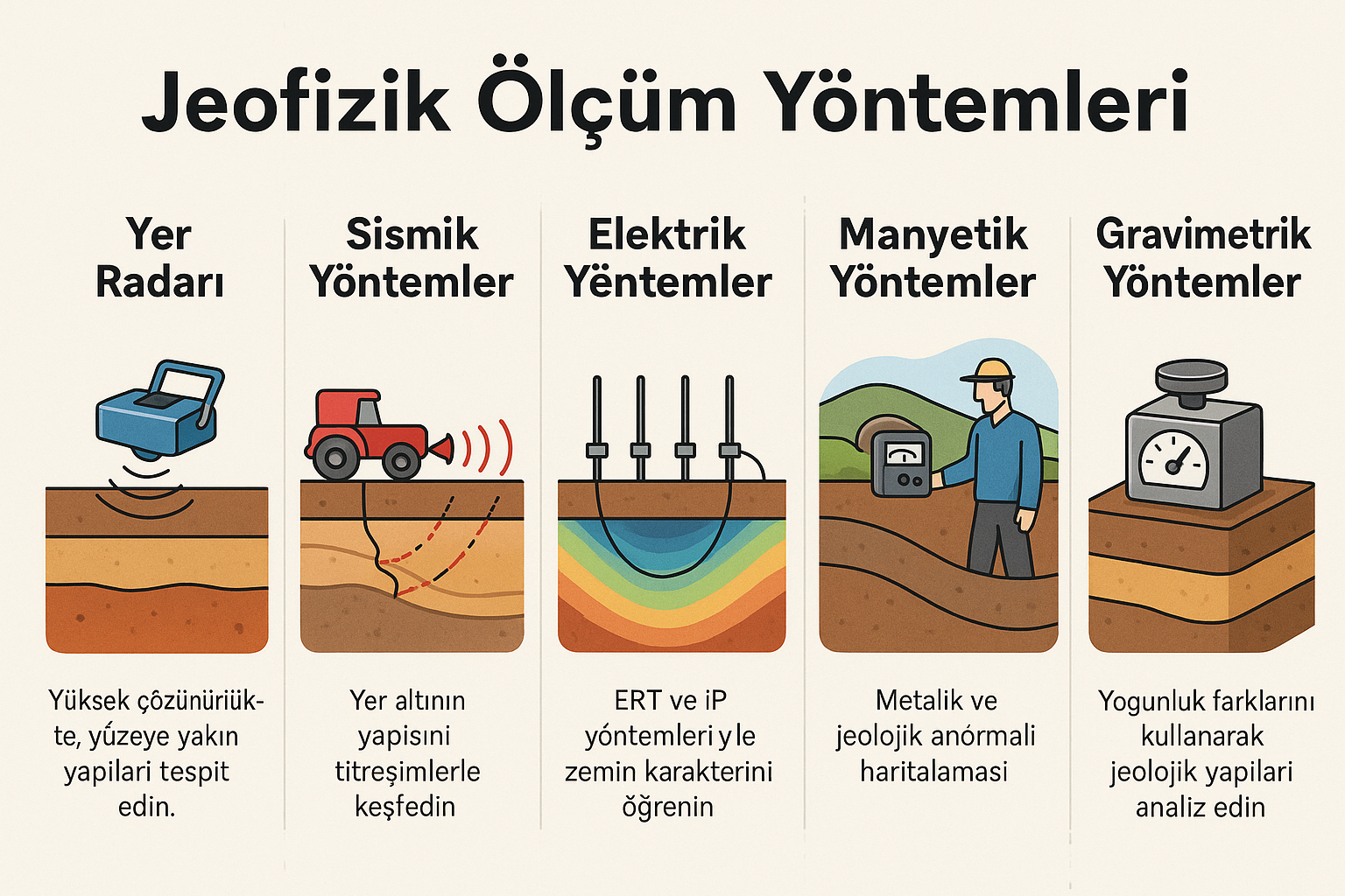 GPR, Sismik, Elektrik rezistivite, Manyetik ve Gravite yöntemlerinde